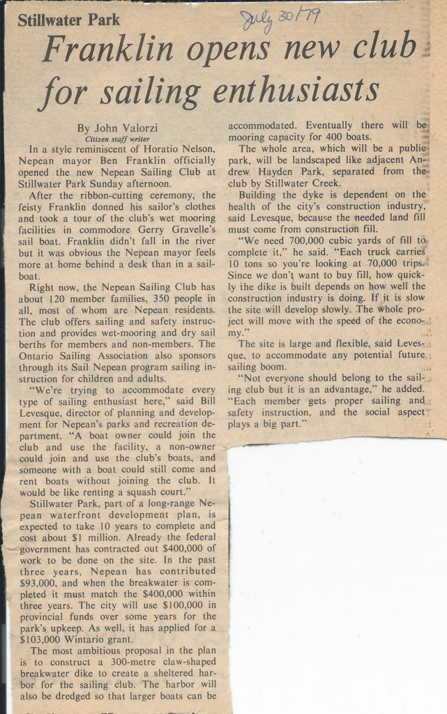 By the time the club officially opened with a ribbon-cutting ceremony on July 29, 1979, NSC had a membership of 120 families, for a total of 350 individuals. The first real Board of Directors had also been installed. Gerry Gravelle was selected as Commodore, apparently because he had been mooring his boat in Graham Bay for the previous four years, and thus had the most experience sailing in the area. Another nine people rounded out the list of board members, including Mayor Ben Franklin, Alderman Hugh MacDonald, and Bill Mantle, who assumed theduties of Past Commodore.