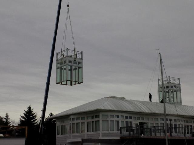 Due to their tendency to leak – with mentions of the leaks dating back to 1993 issues of the Telltale – , our towers were replaced with the beautiful bubbled skylights you see today.